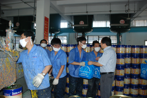 七月下旬,杭州市总工会副主席张明、杭州市工业工会主任谭牡频等一行来公司对奋战在一线的职工进行慰问。图为张明主席来到色漆工段包装组为职工送上了慰问品,并叮嘱他们:工作的时候一定要注意安全、注意身体、平安过暑。