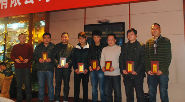 团拜会上表彰了2012年度生产、经营、技术、管理等岗位上涌现出的先进班组和优秀员工,他们有:工业系统“工人先锋号”——质量保证部;工业系统优秀安全班组——低温合成班组;工业系统“十佳创新成果奖”——徐今能;工业系统职业技能带头人——金庆强、阮建红、张志国;公司优秀班组——污水处理站;2012年度公司明星员工——王超山、张旺、金庆强、赵凯锋、叶寿清、冯国建、杨瑞兴、朱文斌、徐嵘(下图)。